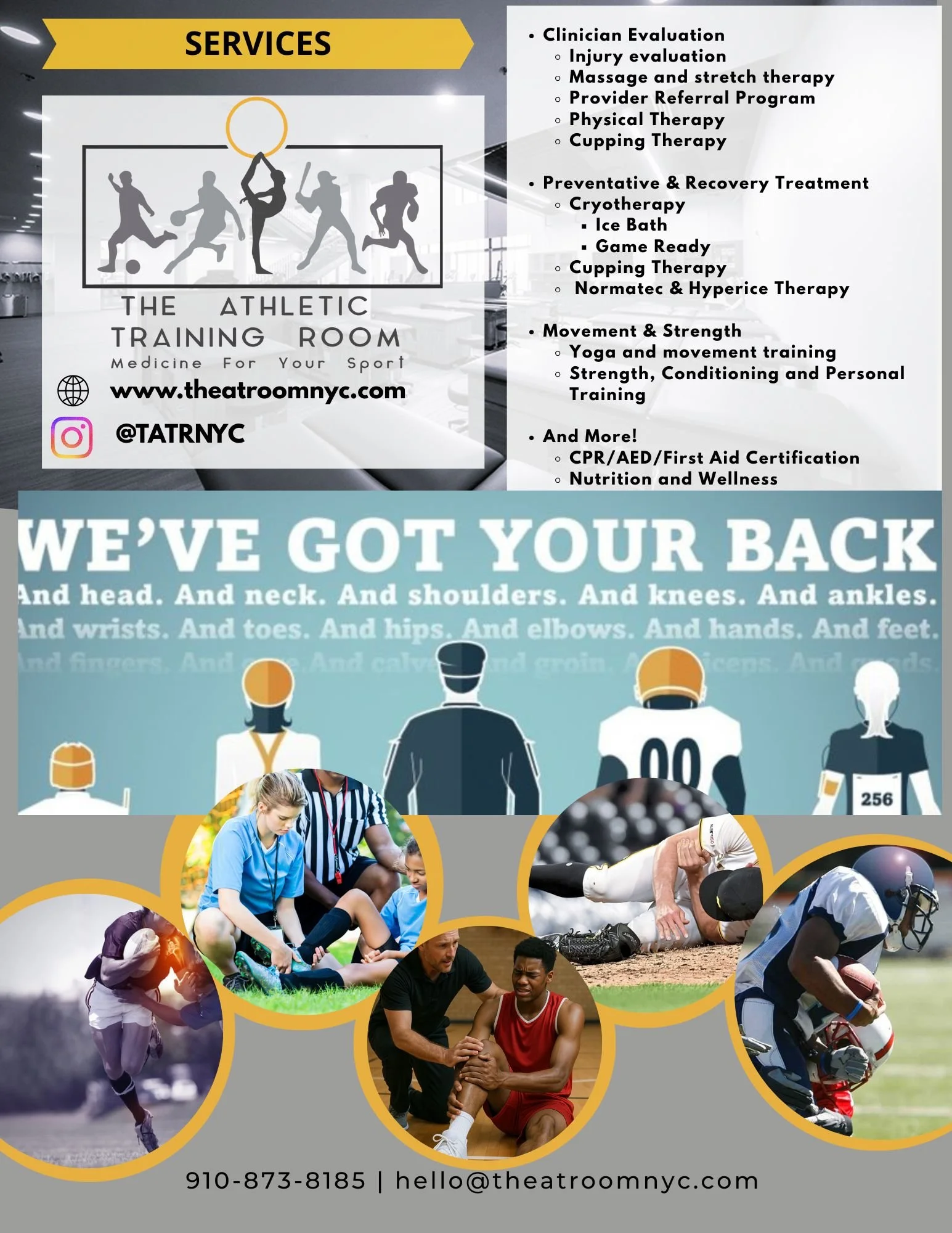 The Athletic Training Room introduces an unprecedented resource for providing patient-centered, elite, on-demand, quality athletic healthcare. We cater to the specific athletic health and safety needs of individuals, companies, teams, and clubs.